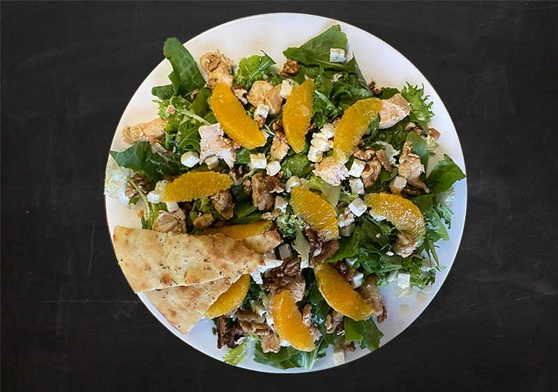 mixed salad, oranges, grilled chicken, walnuts, gorgonzola, vinegar