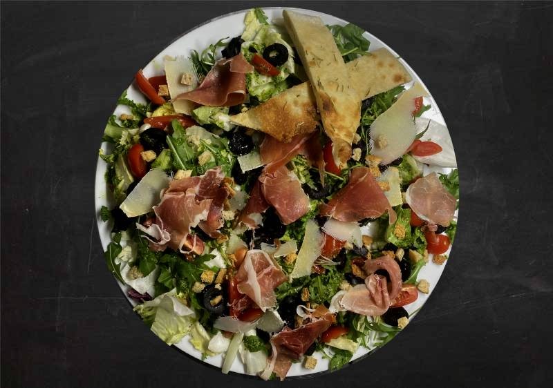 Mixed lettuce, Parma ham, cherry tomatoes, olives, parmesan cheese, herb croutons, arugula pesto