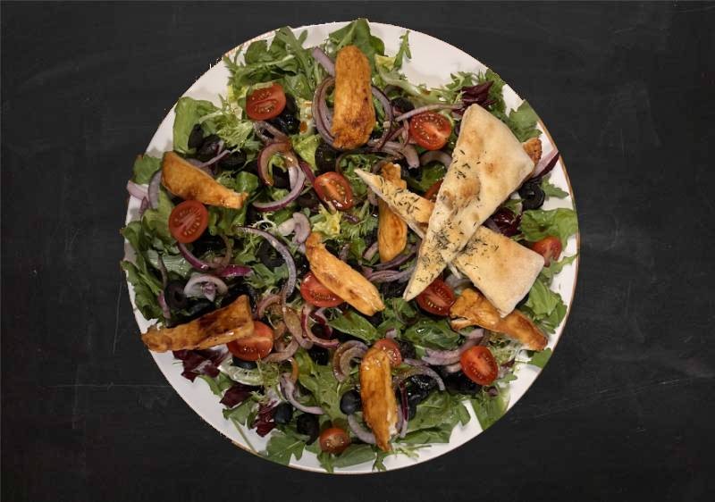 seasoned mixed salad, olives, feta cheese, grilled chicken, croutons, mustard and honey sauce