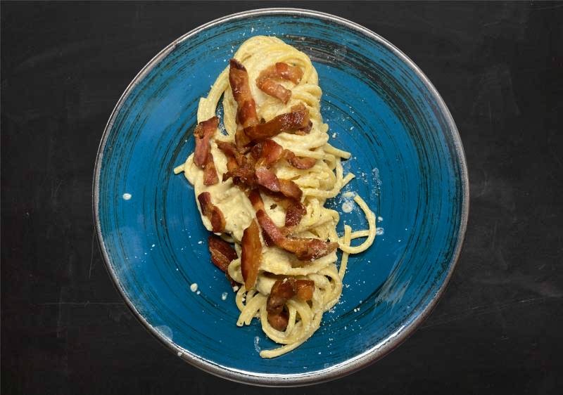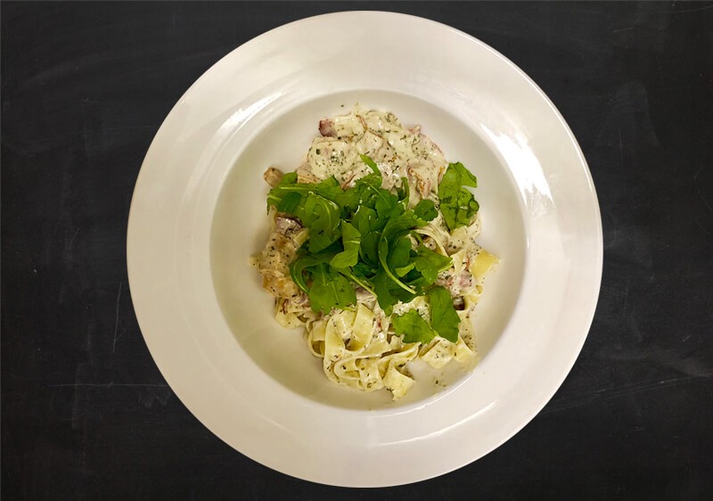 Makaron tagliatelle z boczkiem i kurkami w sosie śmietanowym z pietruszką, serwowany z rucolą
