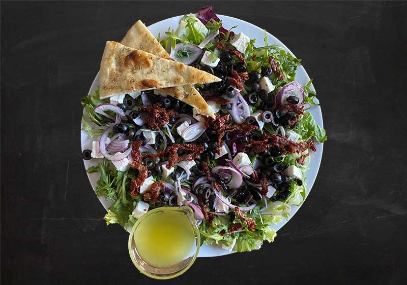 seasoned mixed salad, red onion, cherry tomato, dried tomatoes, feta cheese.