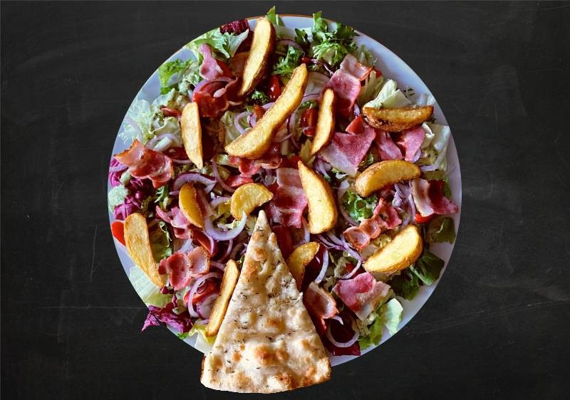 Mix sałat, czerwona cebula, pomidory koktajlowe, boczek, ziemniaki opiekane