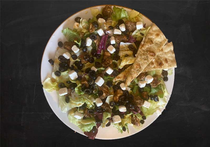 seasoned mixed salad, olives, feta cheese, grilled chicken, croutons, mustard and honey sauce